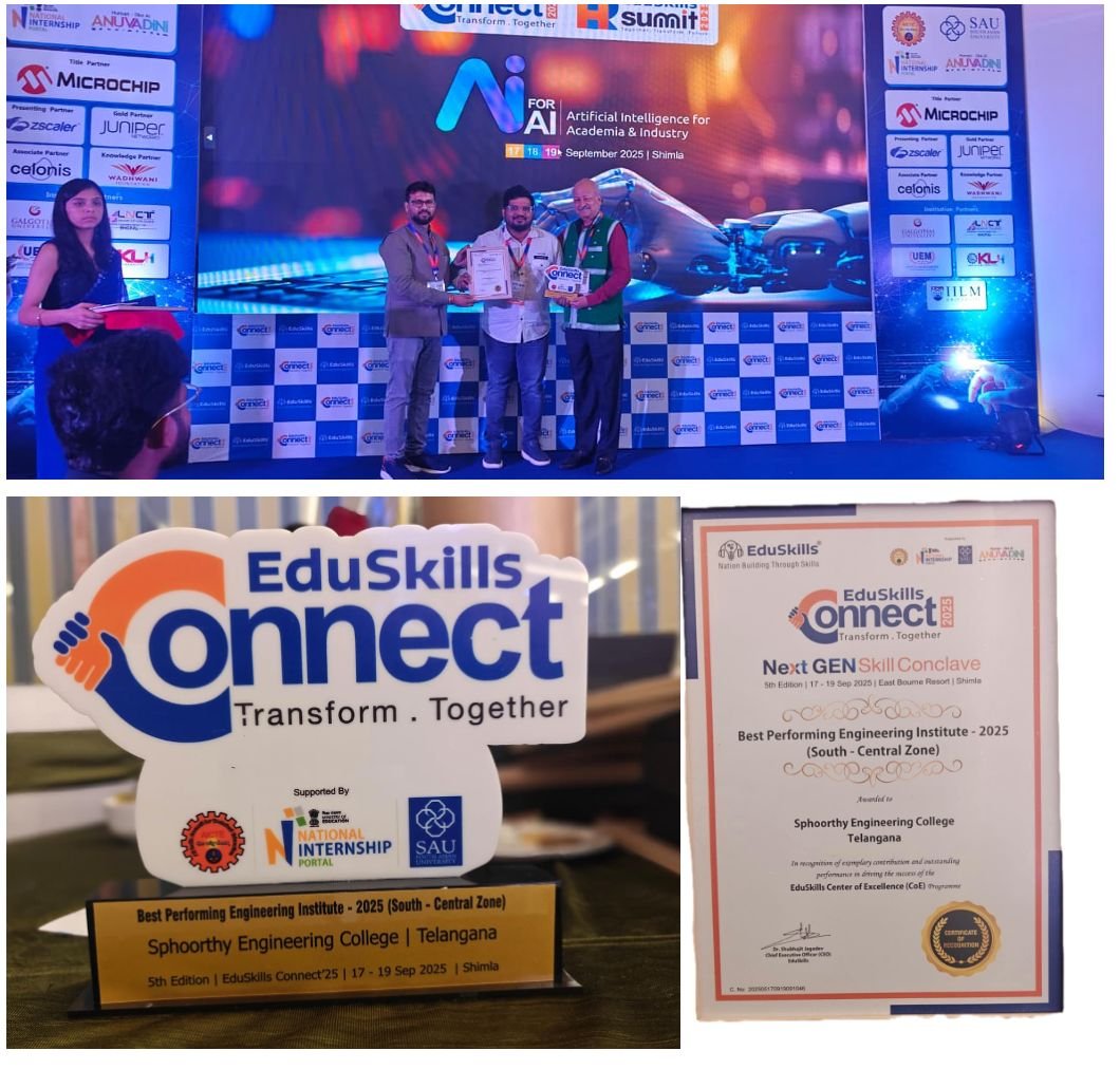 Sphoorthy Engineering College awarded with “Best Performing Engineering Institute – 2025 (South - Central Zone)” in recognition of exemplary contribution and outstanding performance in driving the success of the EduSkills Center of Excellence (CoE) Programme during Next GEN Skill Conclave 5th Edition held on 17 - 19 Sep 2025 at East Bourne Resort, Shimla.