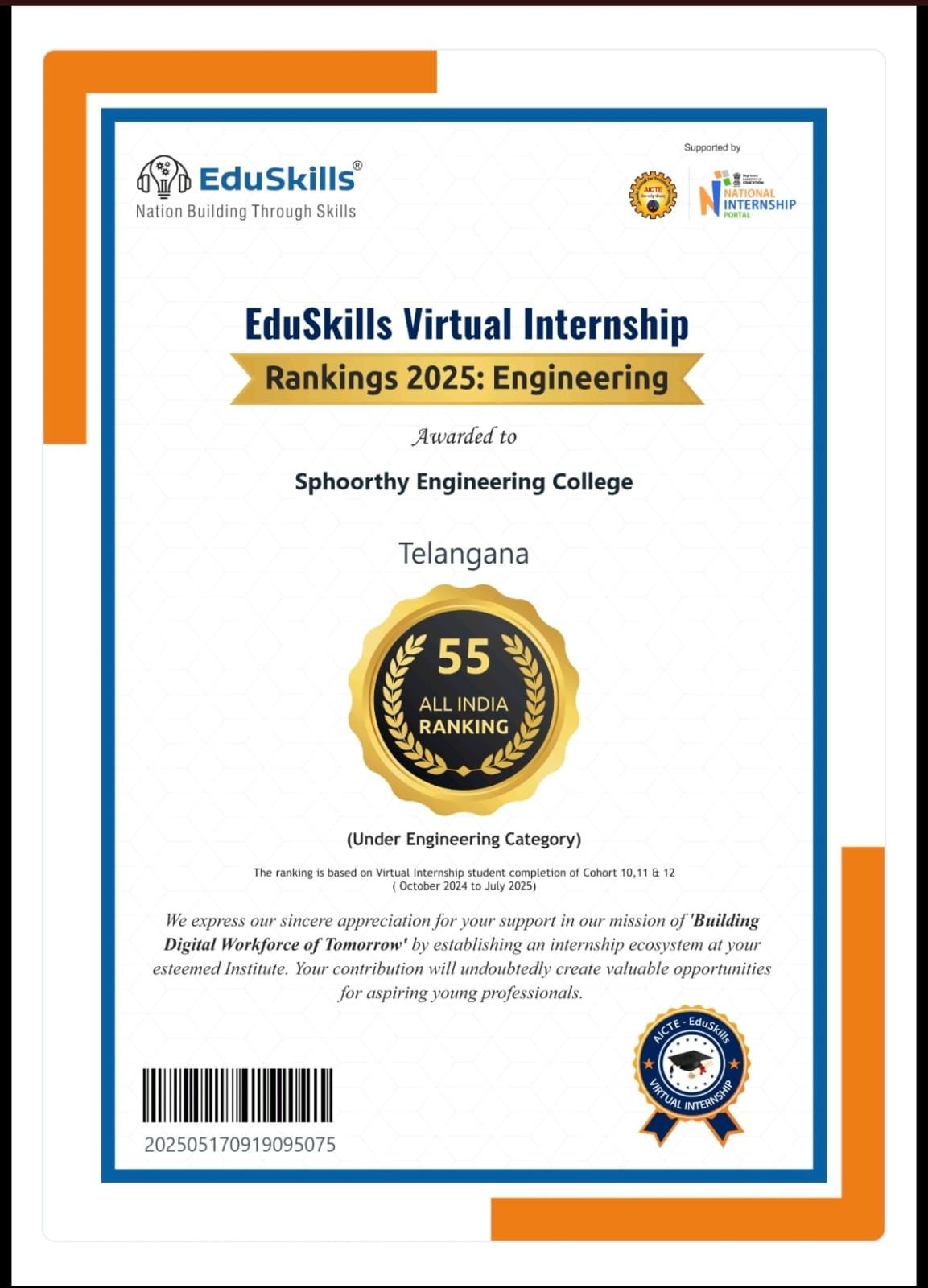 Sphoorthy Engineering College was awarded with 55 ALL INDIA RANKING (Under Engineering Category) by “EduSkills Virtual Internship Rankings 2025: Engineering”. The ranking is based on Virtual Internship student completion of Cohort 10,11 & 12 ( October 2024 to July 2025).