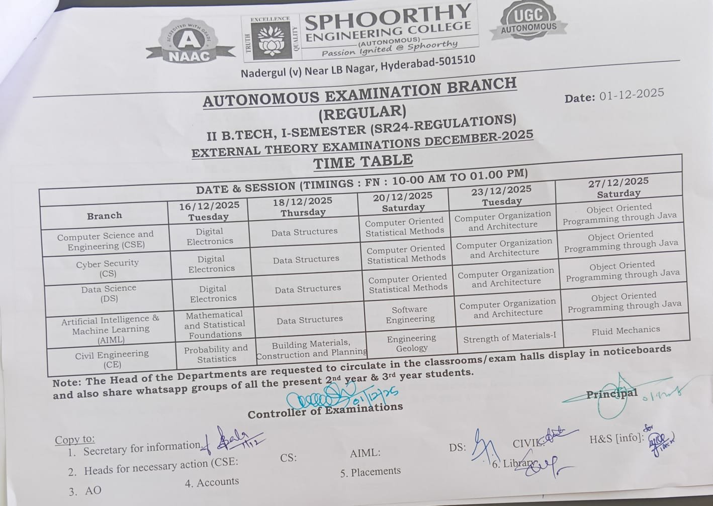 II B.TECH, I-SEMESTER (SR24-REGULATIONS) EXTERNAL THEORY EXAMINATIONS DECEMBER-2025 |