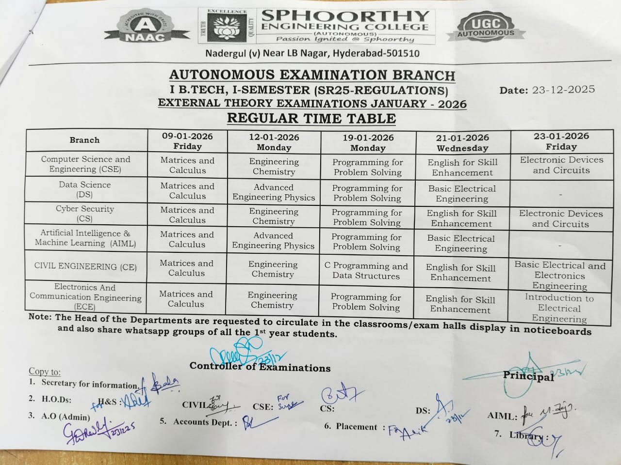 I B.TECH, I-SEMESTER (SR25-REGULATIONS) EXTERNAL THEORY EXAMINATIONS JANUARY - 2026 |
