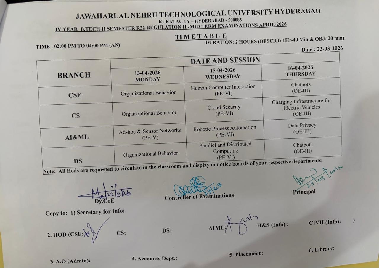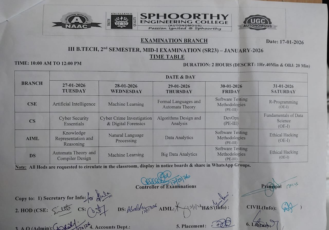 III B.TECH, 2nd SEMESTER, MID-I EXAMINATION (SR23) - JANUARY-2026 TIME TABLE |