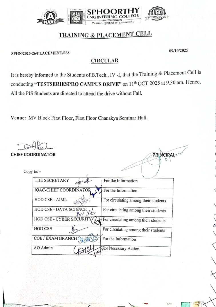 - Training and Placement Department is organising NextGen employability program for 2025 passout students Details Posted On : 25 Nov 2024