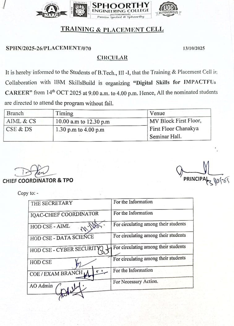 - Training and Placement Cell in Collaboration with IBM SkillsBuild is organising Digital Skills for Impactful Career on 14-10-2025 Details Posted On : 13 Oct 2025