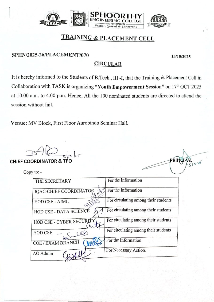 - Training & Placement Cell in Collaboration with TASK is organizing Youth Empowerment Session on 17th OCT 2025 Details Posted On : 16 Oct 2025