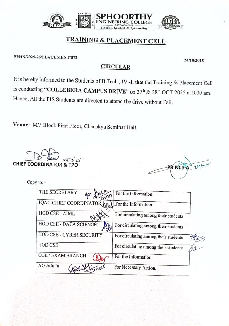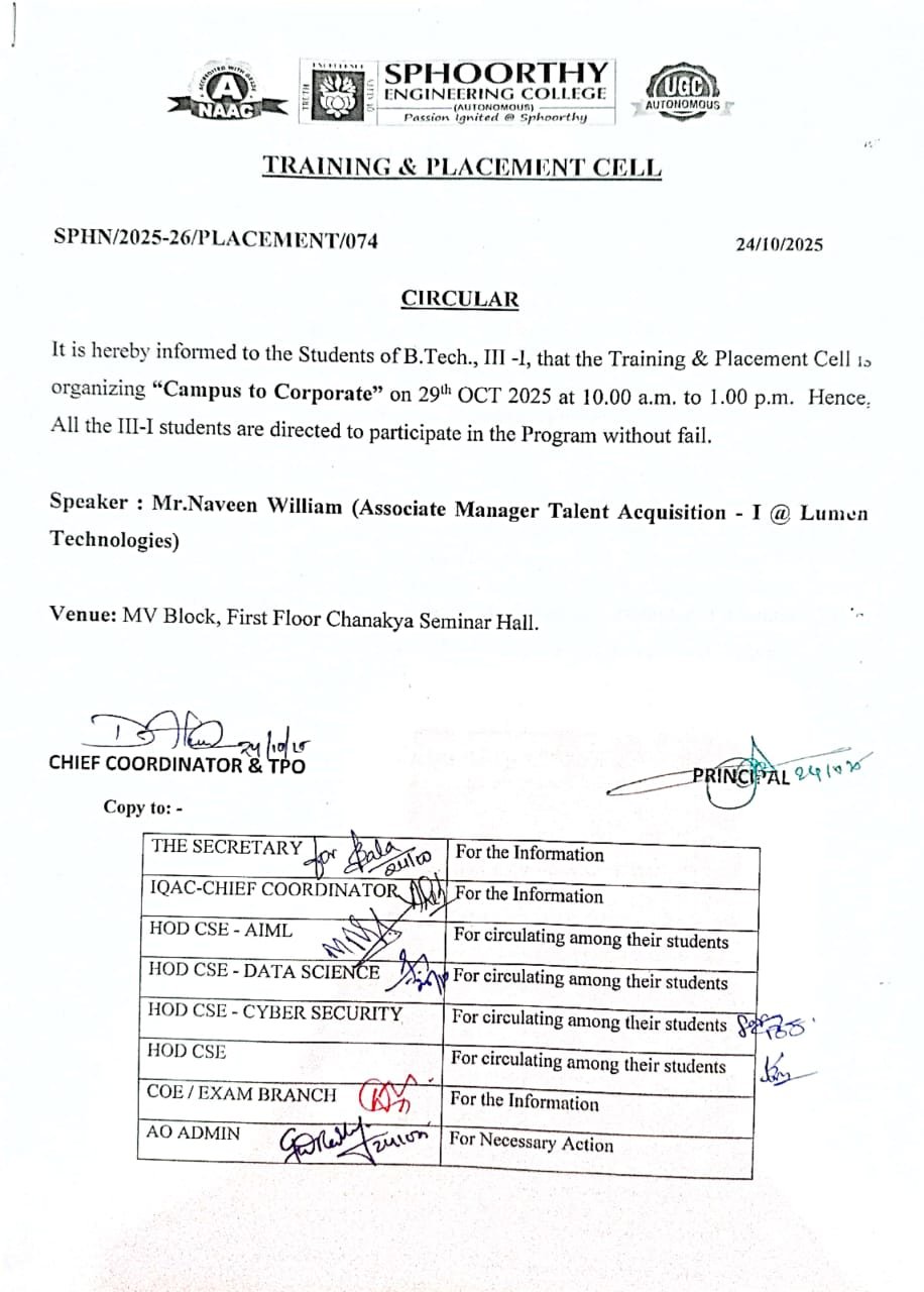 - Training & Placement Cell is organizing Campus to Corporate program for 3rd year students on 29th OCT 2025 Details Posted On : 28 Oct 2025